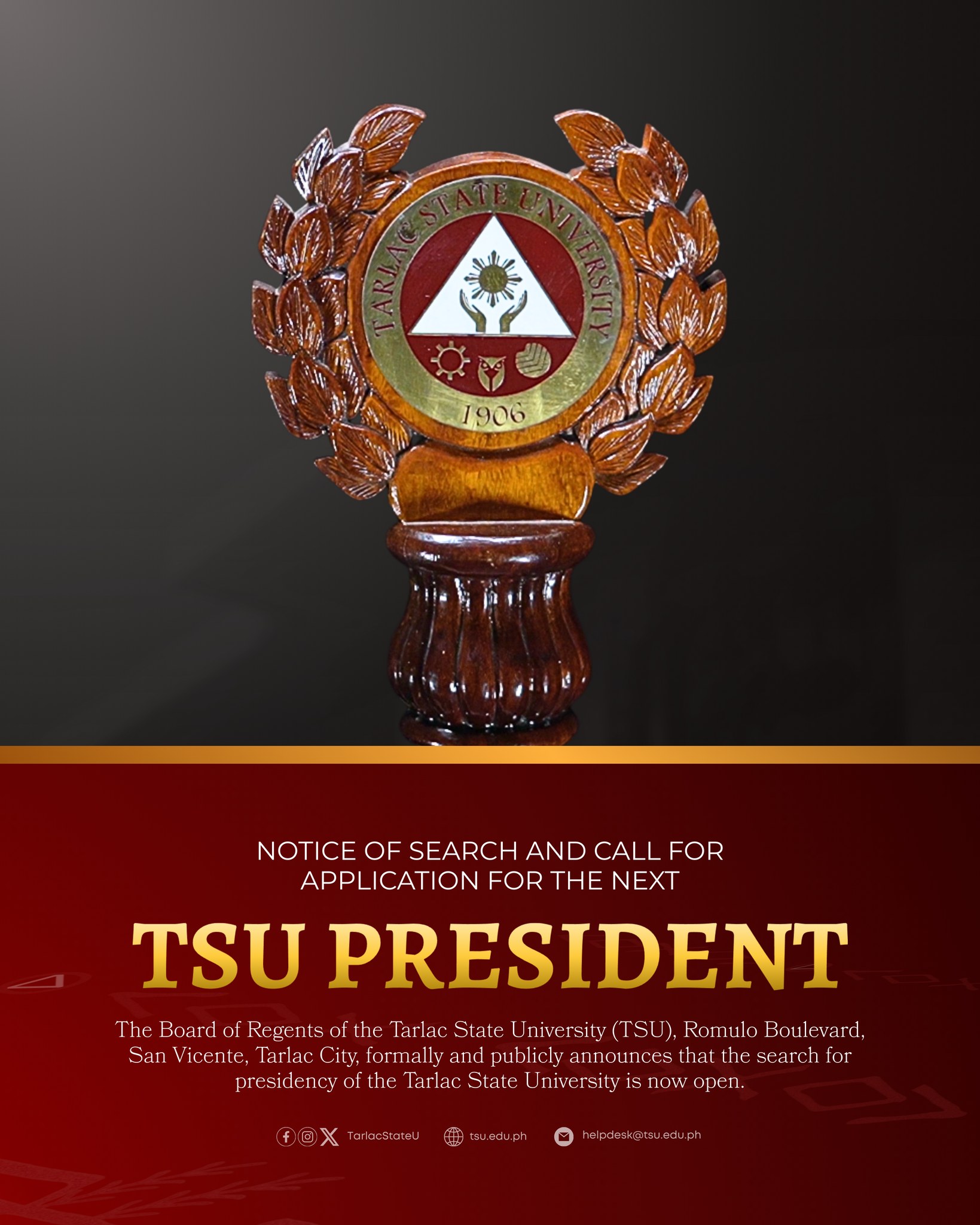 In view of the end of term of the incumbent President of the Tarlac State University on March 31, 2026, and in accordance with the provisions of Republic Act 8292, CMO No. 7, s. 2022, and Republic Act 11695 and its IRR, the Board of Regents of the Tarlac State University (TSU), Romulo Boulevard, San Vicente, Tarlac City, formally and publicly announces that the search for presidency of the Tarlac State University (TSU) is now open.
