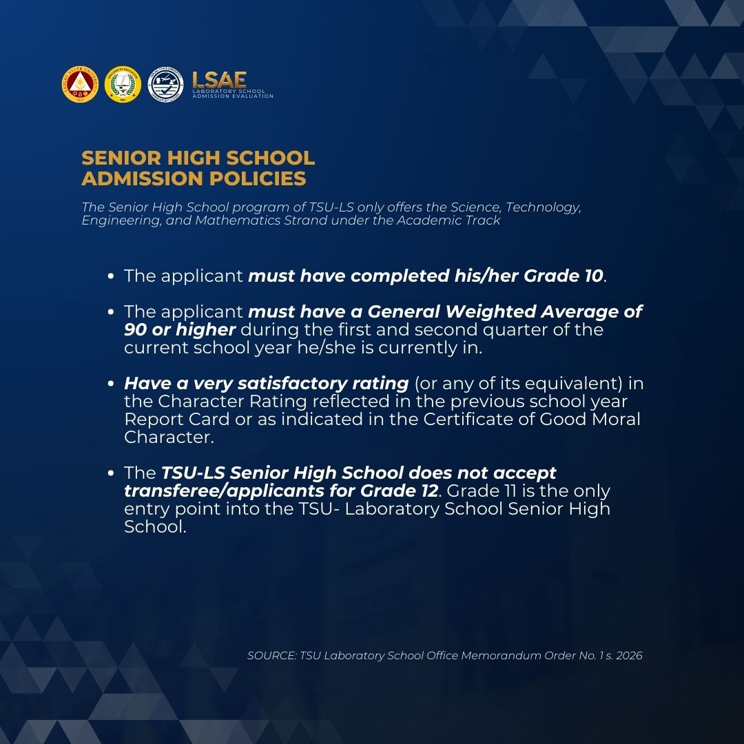 The online application for the Tarlac State University-Laboratory School Admission Evaluation (TSU-LSAE) will be open beginning February 1, 2026 (Sunday) until February 28, 2026 (Saturday).